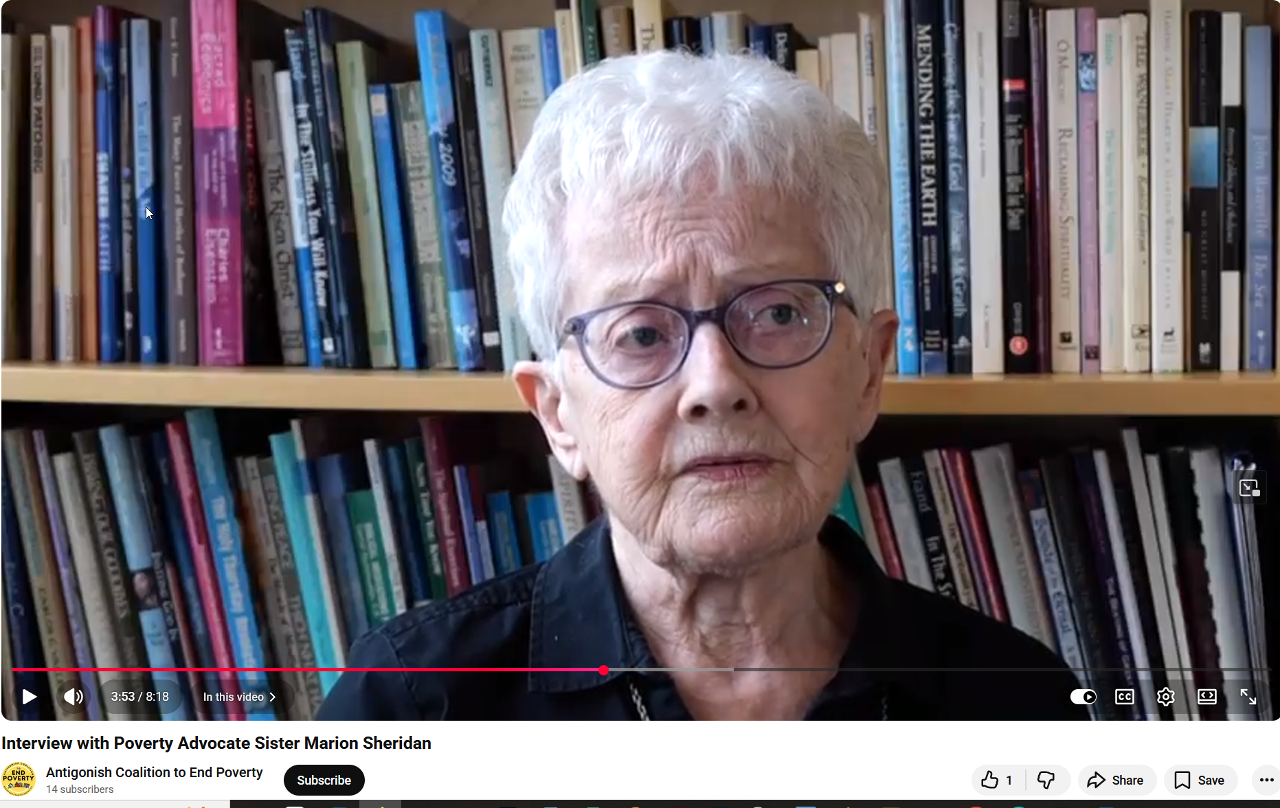 I want to share with you videos that the Antigonish Coalition to End Poverty have done, which were launched this October 17th, the International Day for the Eradication of Poverty. The videos are interviews with a range of people, mostly those working in direct support organizations, talking about the reality of poverty in the town and county. Our own Sister Marion Sheridan is featured in one of the videos and does a wonderful job!